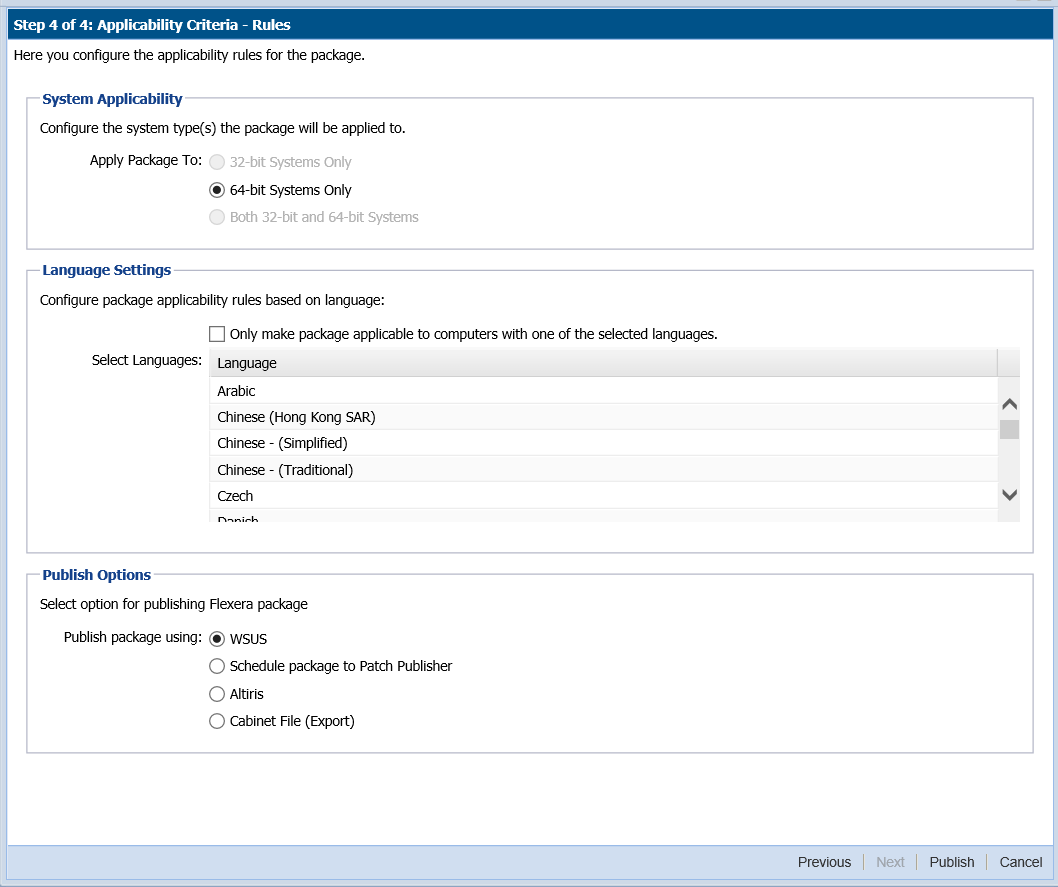 In Step 4 you should specify if you want to limit the package to 32-bit or 64-bit systems or computers with specific operating system languages. The patch file to be deployed will be automatically downloaded in the background by the Software Vulnerability Manager console. Once this is completed the Software Vulnerability Manager console will publish the update package into the WSUS/System Center.