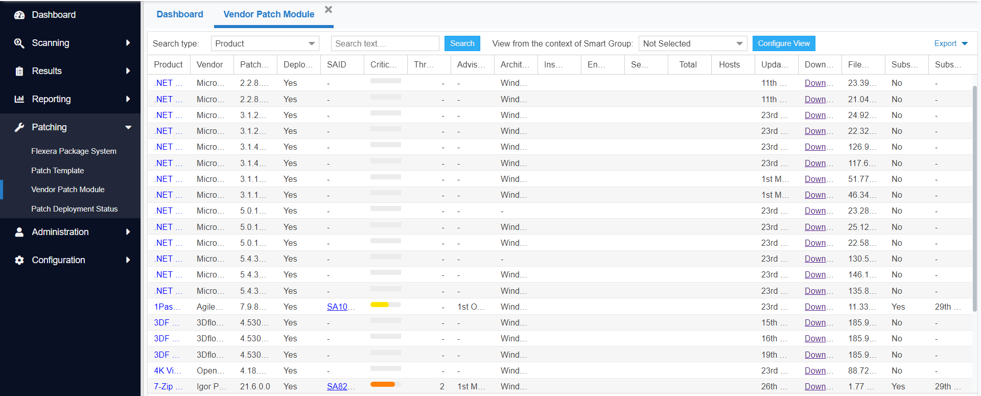 The Vendor Patch Module page displays a list of products for which Software Vulnerability Manager can automatically create an Update/Uninstall package. Right-click any of the listed products to view the available options.