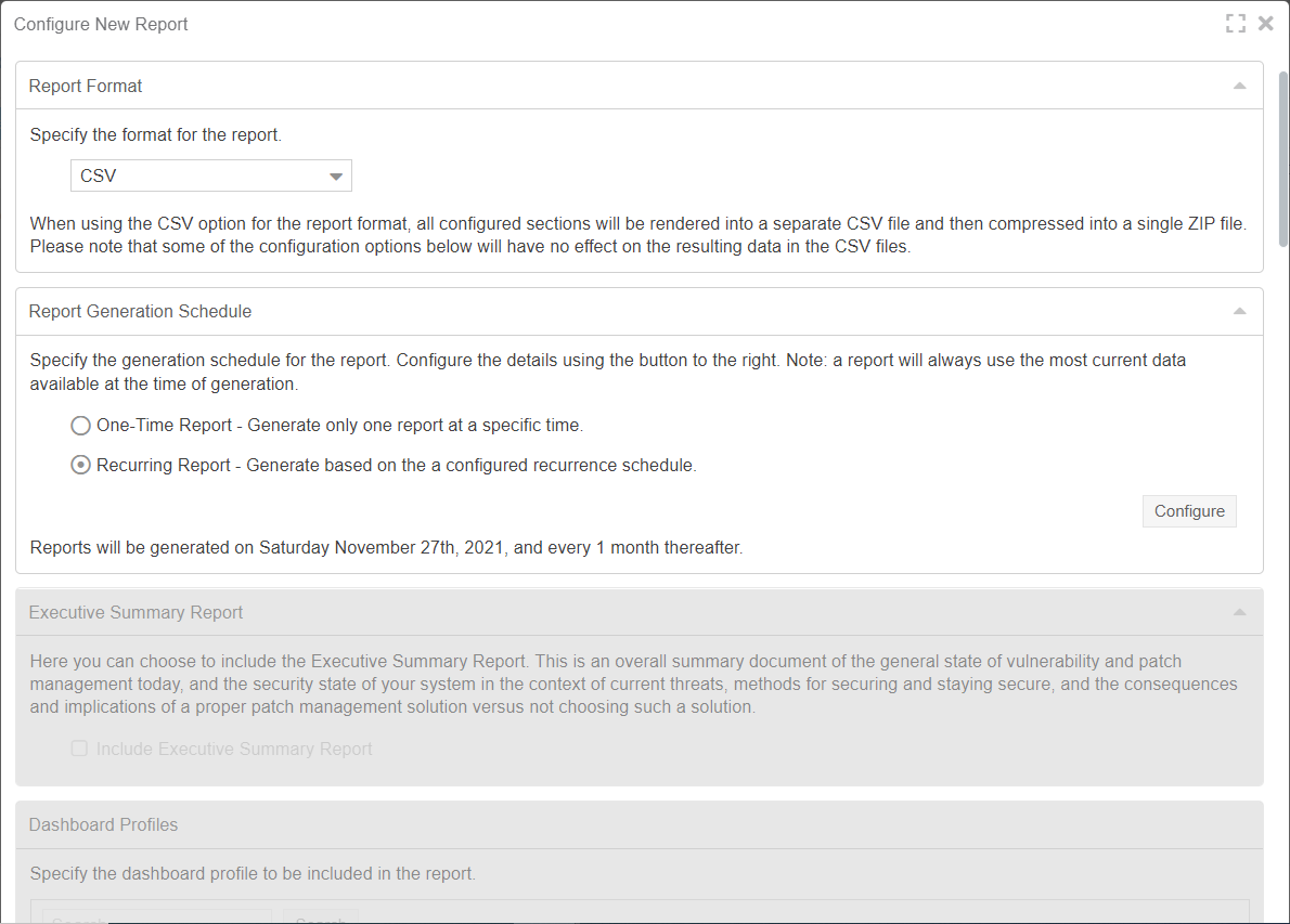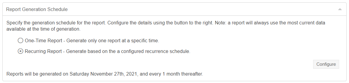 In the Report Generation Schedule, choose either a One-time only report or a recurring one (daily, weekly, monthly), and then click Configure to select the report distribution date or frequency schedule.