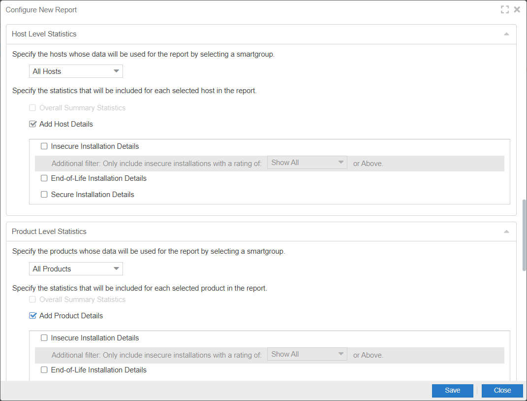 Insecure Installation Details for both Host Level Statistics and Product Level Statistics are enabled only when you select Add Product Details and Add Host Details respectively.