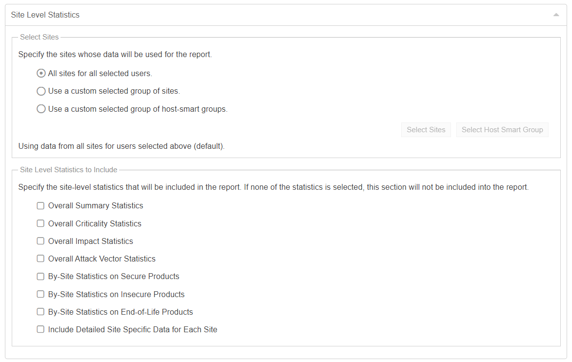 Executive Summary Report , Dashboard Profiles , Site Level Statistics , and Overall Summary Statistics Check box for both Host Level Statistics and Product Level Statistics are disabled.