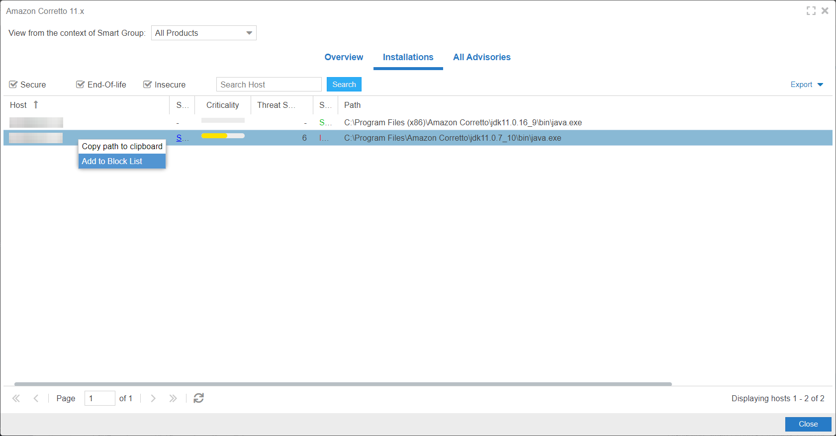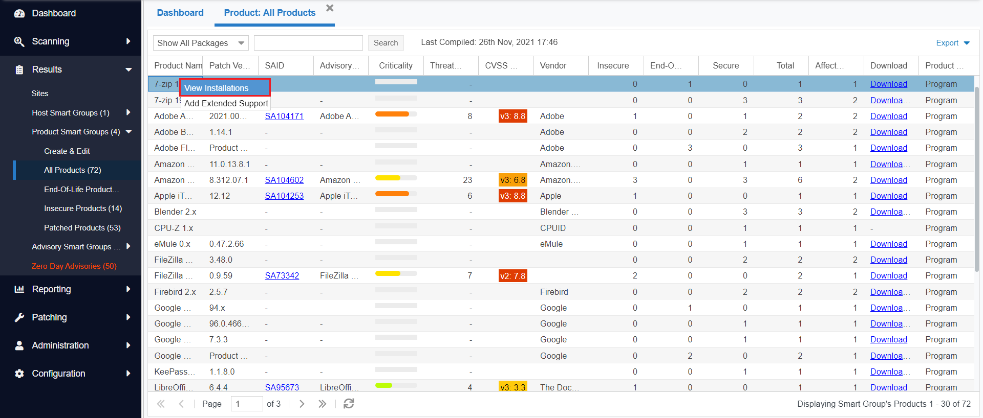 To see the installation details of a product in the Product Smart Groups, right-click a product in the grid and select View Installations from the menu option to display the installation details.
