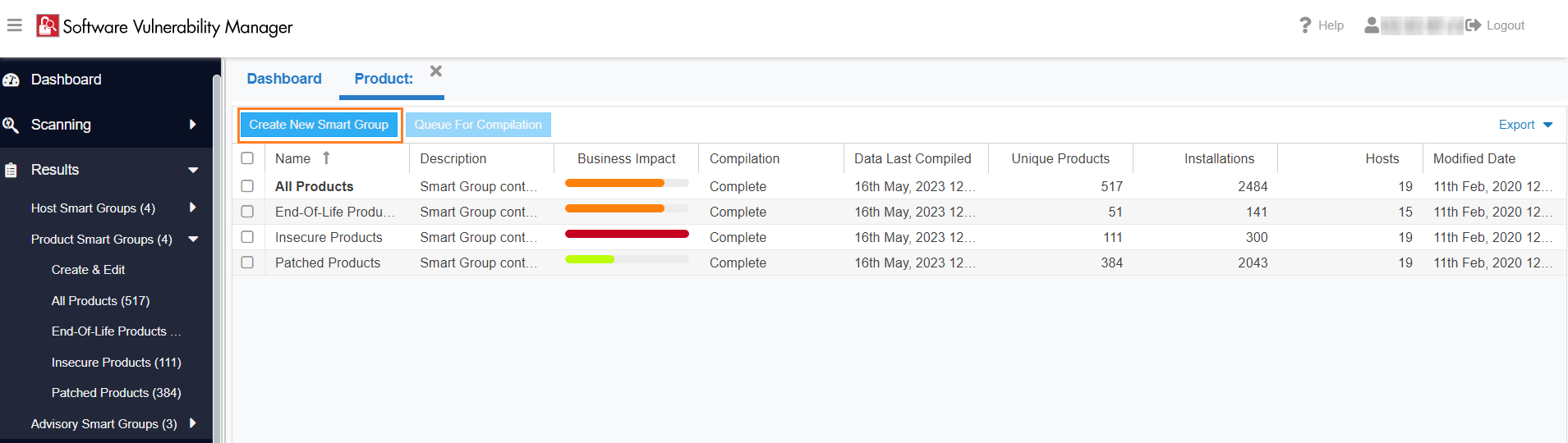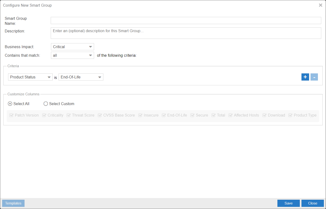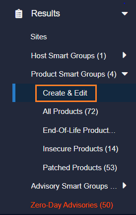 Smart Group Criteria Description Product Status Filter by product status. Criticality Filter by criticality. Threat Score Filter by threat scores. SAID Creation Date Filter by SAILD creation date. Last Scan Date Filter by last scan date of the host. Silent Installation Filter by silent installation. Site Filter by site name. Host Filter by host name. Product Filter by product name. System Platform Filter by system platform. Software Type Filter by software type. CVSS2 Score Filter by CVSS2 score. CVSS3 Score Filter by CVSS3 score. CVSS4 Score Filter by CVSS4 score. Product Name Filter product name using begins with,starts with,contains, anddoes not containcondition. Then enter the Product name in the text fieldHost Name Filter host name using begins with,starts with,contains, anddoes not containcondition. Then enter the Host name in the text field.Site Name Filter site name using begins with,starts with,contains, anddoes not containcondition. Then enter the Site name in the text field.Vendor Name Filter vendor name using begins with,starts with,contains, anddoes not containcondition. Then enter the Vendor name in the text field.Operating System Filter by operating system from selected list. Operating System Build Filter by specific version of the Operating System. Fore more information, see Filter Product Smart Groups on Operating System Build Version. -