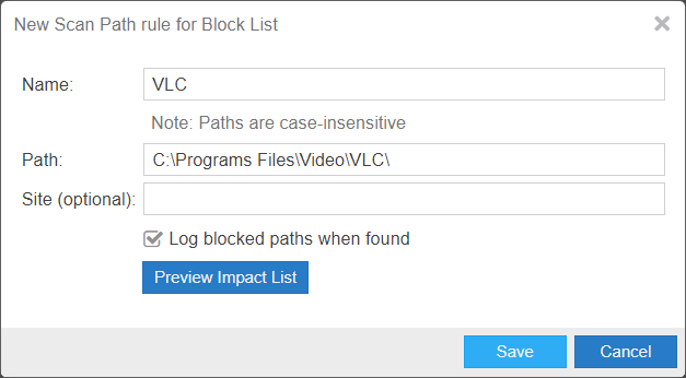 Use this feature to create either a Allow list or Block list of paths/locations to restrict the locations inspected by the Software Vulnerability Manager scan.