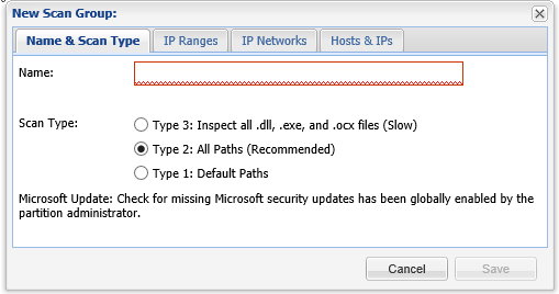 After navigating through the different tabs: Name & Scan Type, IP Ranges, IP Networks and Hosts & IPs, click Save to create the scan group.