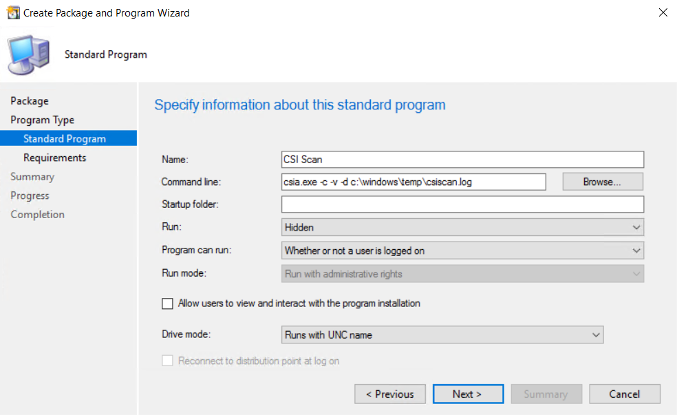 • Command Line: csia.exe -c -si 120 -v -d c:\windows\temp\csiscan.log (creates a scan log file up to 16 MB in size)
