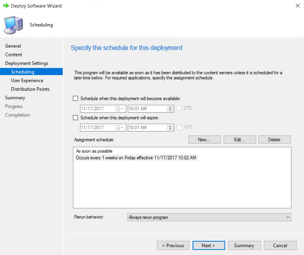 5. On the Scheduling page, in the Assignment schedule click New . Schedule a scan for as soon as possible and create a weekly scanning schedule. Also configure the Rerun behavior deployment to Always rerun program .